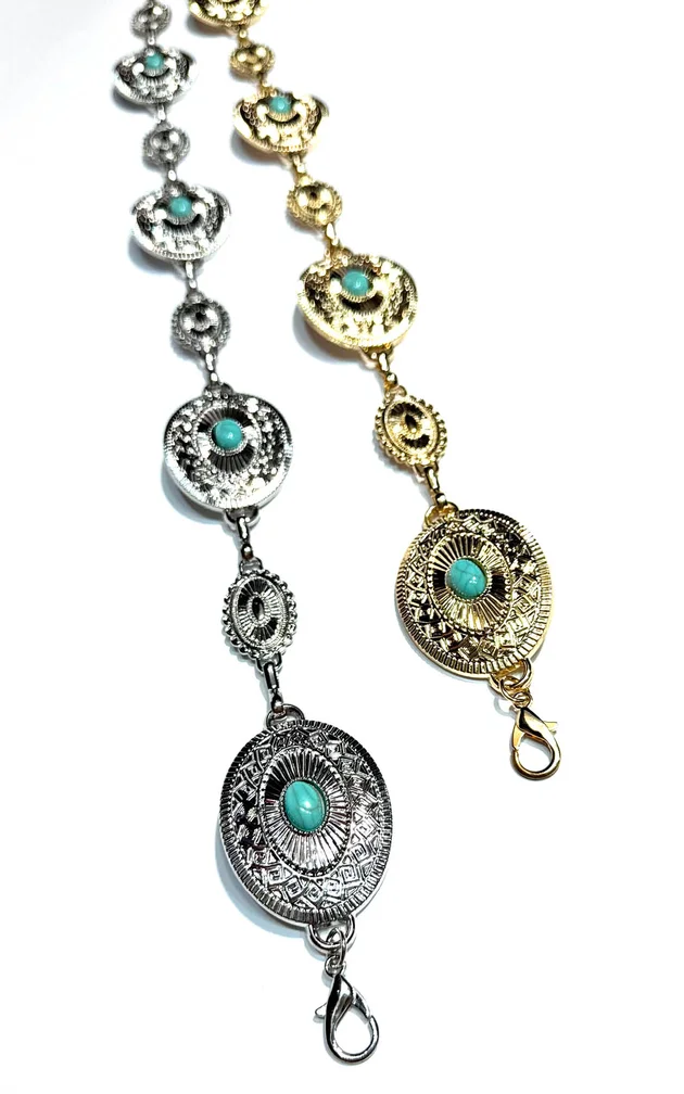 O Cinto Metal trabalhado é um acessório marcante que une acabamento premium, detalhes trabalhados e a presença vibrante da pedra turquesa ao centro de cada medalhão. Uma peça pensada para transformar o look com personalidade, brilho e elegância imediata.