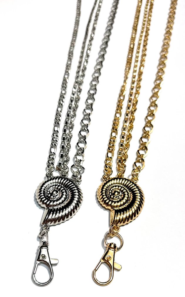 - Material: Confeccionado em metal com elos robustos e pingente central em formato de caracol esculpido.