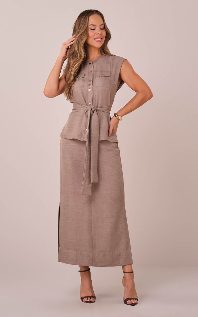 Confeccionado em alfaiataria texturizada, este conjunto une a leveza da modelagem fluida com a sofisticação de acabamentos bem pensados. Ideal para ocasiões em que o visual precisa comunicar estilo com discrição e refinamento. A composição maxi midi das peças alonga a silhueta e proporciona versatilidade no uso, seja com salto ou rasteira.