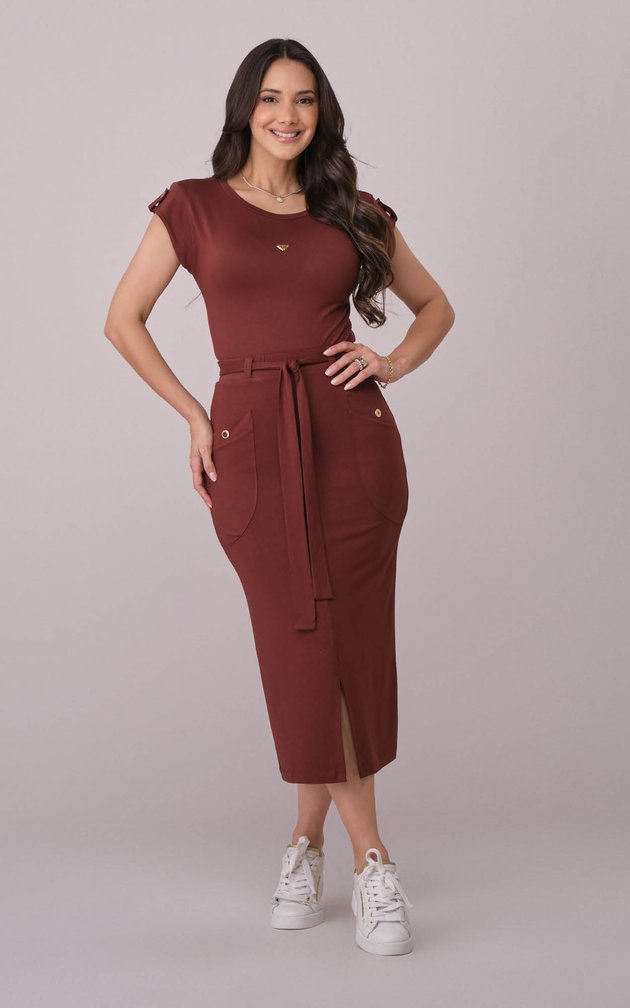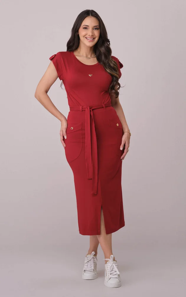 A saia midi com fenda frontal cria harmonia e fluidez ao caminhar.