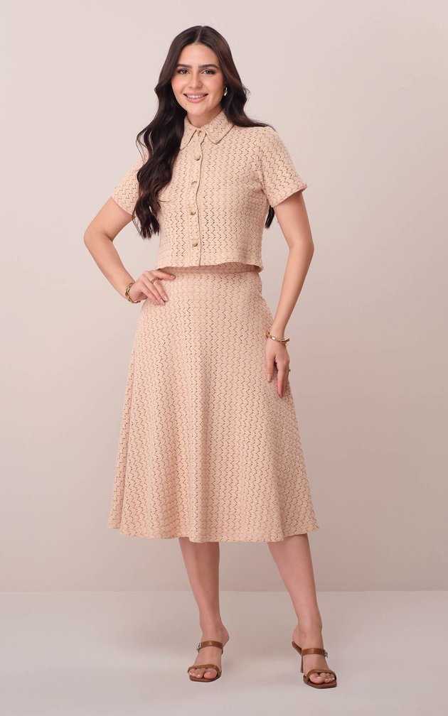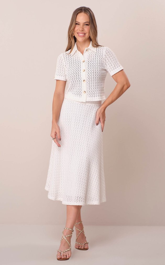 Este conjunto em crochê traduz o charme da moda praia premium com um design elegante e versátil. A blusa curta com botões funcionais e a saia midi forrada unem estilo e conforto, proporcionando composições sofisticadas para momentos à beira-mar ou ocasiões casuais de verão.