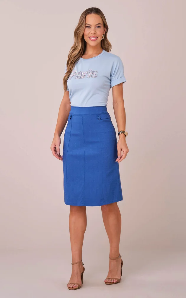 A peça reúne elementos clássicos e detalhes contemporâneos, ideal para mulheres que valorizam elegância, conforto e acabamento impecável. Com estrutura em bengaline encorpado, a saia entrega caimento alinhado ao corpo sem marcar, além de oferecer conforto por conta da elasticidade do tecido.