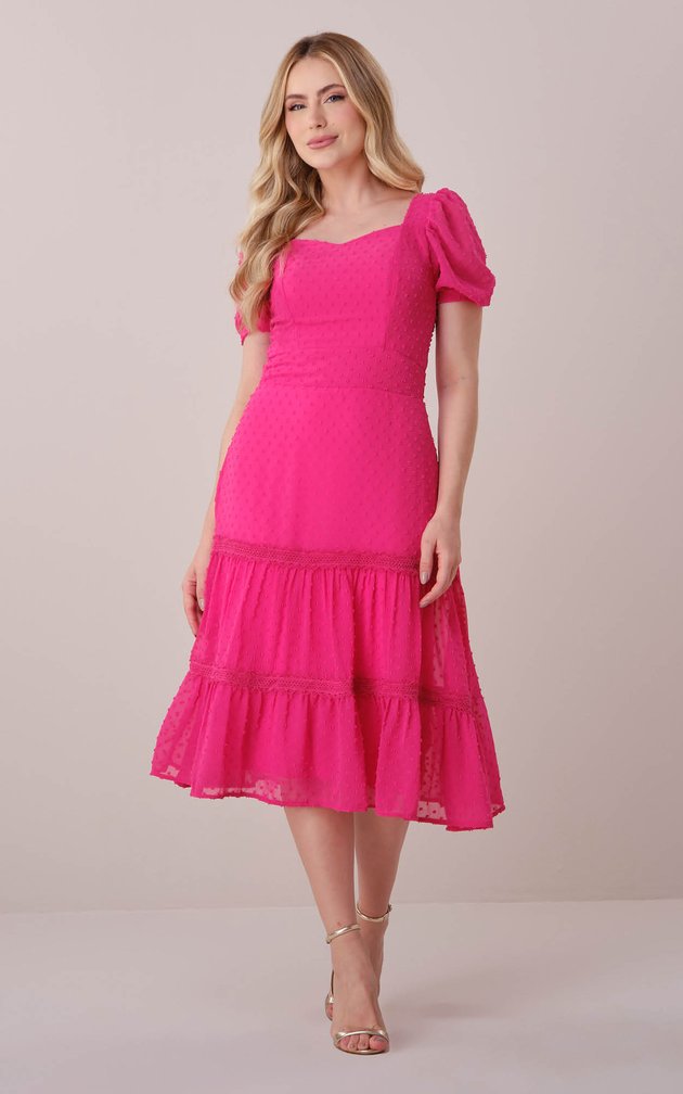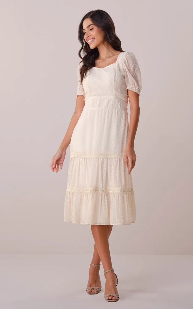Confeccionado no sofisticado tecido crepe com poá em alto relevo, o modelo apresenta uma silhueta marcante e romântica, com destaque para o decote coração que valoriza o colo de forma delicada. Totalmente forrado, garante conforto e discrição, enquanto as rendas aplicadas e os babados na saia conferem um toque feminino e atemporal. Possui zíper nas costas para melhor ajuste ao corpo.