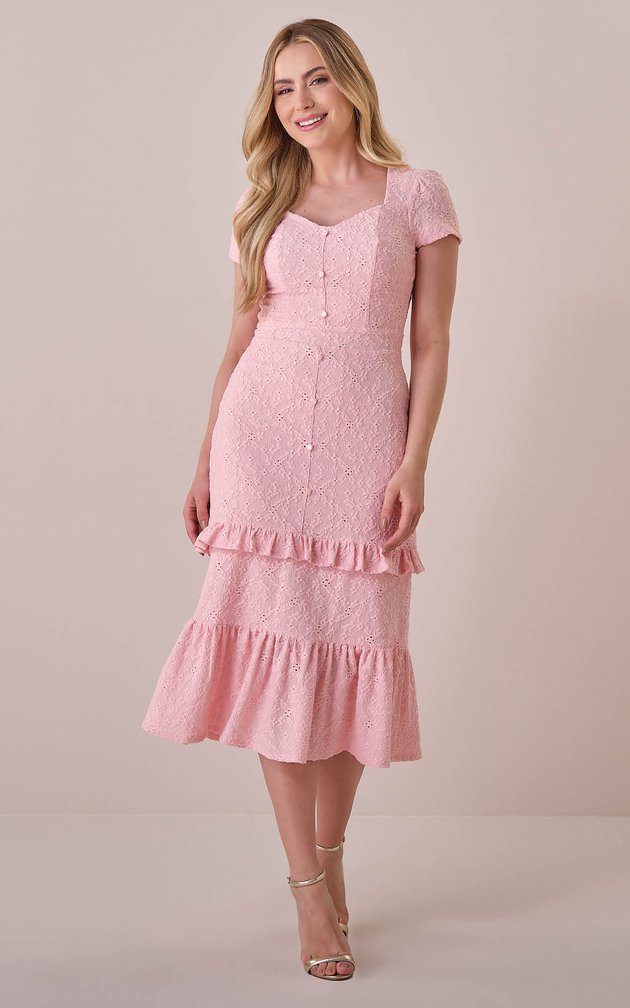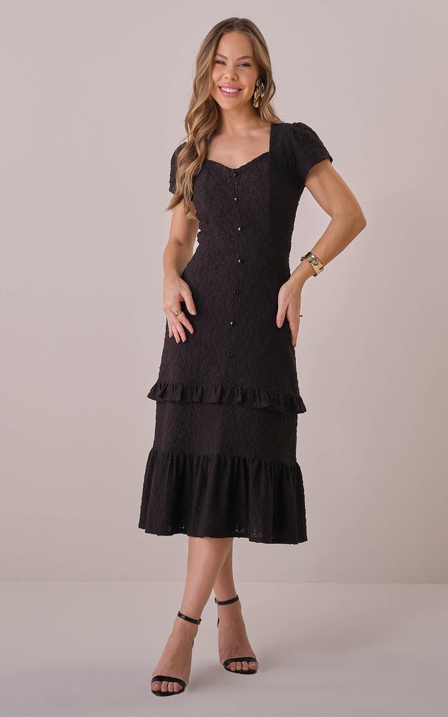 O Vestido Midi em Malha Jacquard é a escolha perfeita para quem valoriza elegância com toque romântico. Confeccionado em tecido texturizado, possui mangas curtas delicadas, decote estruturado e botões decorativos tingidos no tom da peça. A modelagem valoriza a silhueta com caimento impecável, babados estrategicamente aplicados e forro interno para garantir conforto. Ideal para ocasiões especiais ou para elevar produções do dia a dia.