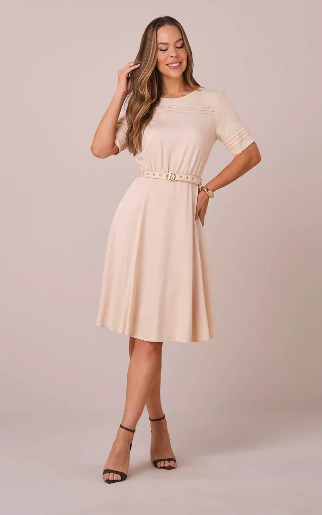 - Modelagem: Curta evasê, com cintura marcada e saia fluida.