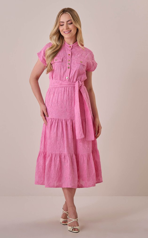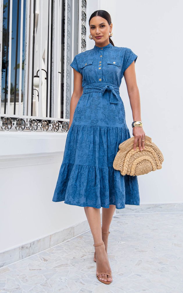 Este vestido midi confeccionado em algodão bordado une delicadeza e estrutura em uma peça versátil e sofisticada. Cada detalhe foi pensado para valorizar a feminilidade com conforto e elegância, tornando-o ideal para ocasiões que pedem um visual refinado e marcante.