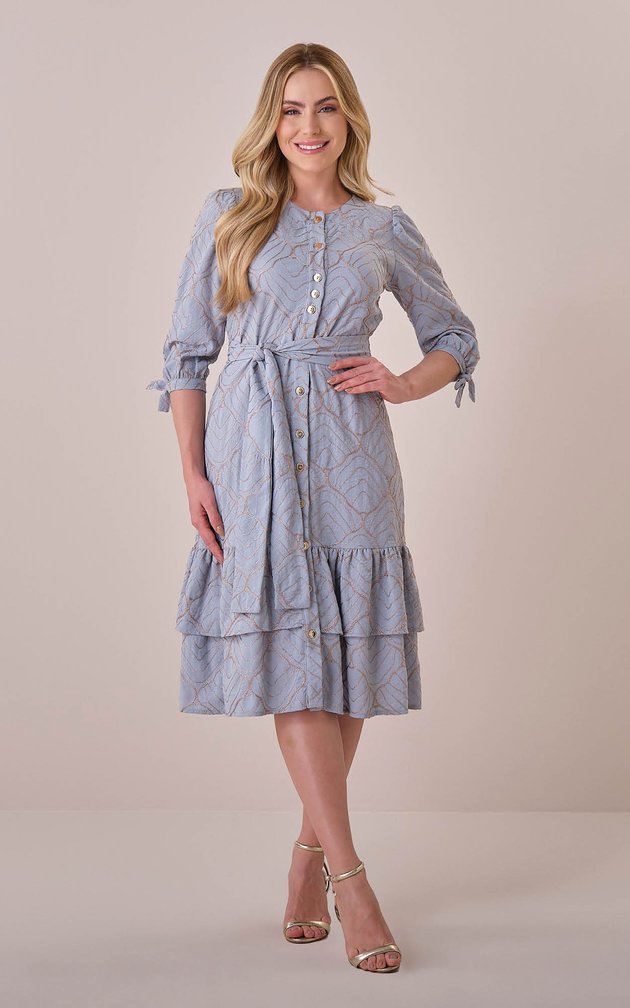 Com design elegante e toque artesanal, este vestido traduz leveza e sofisticação. O tecido bordado traz um visual único, enquanto a modelagem soltinha com faixa ajustável marca a cintura com delicadeza. Os babados na barra e os botões personalizados finalizam o look com charme e presença — ideal para ocasiões especiais ou produções elegantes do dia a dia.