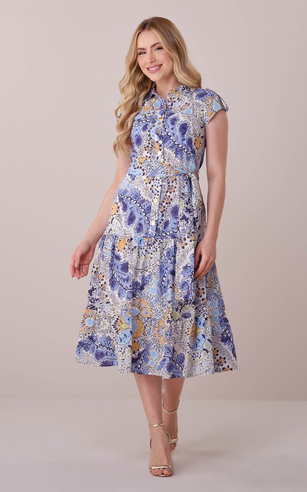 Inspirado na estética clássica do verão europeu, este vestido traduz sofisticação e frescor. A estampa remete à cerâmica artesanal, enquanto o algodão estruturado garante conforto e caimento impecável. Uma peça versátil, ideal para ocasiões diurnas que pedem elegância natural.