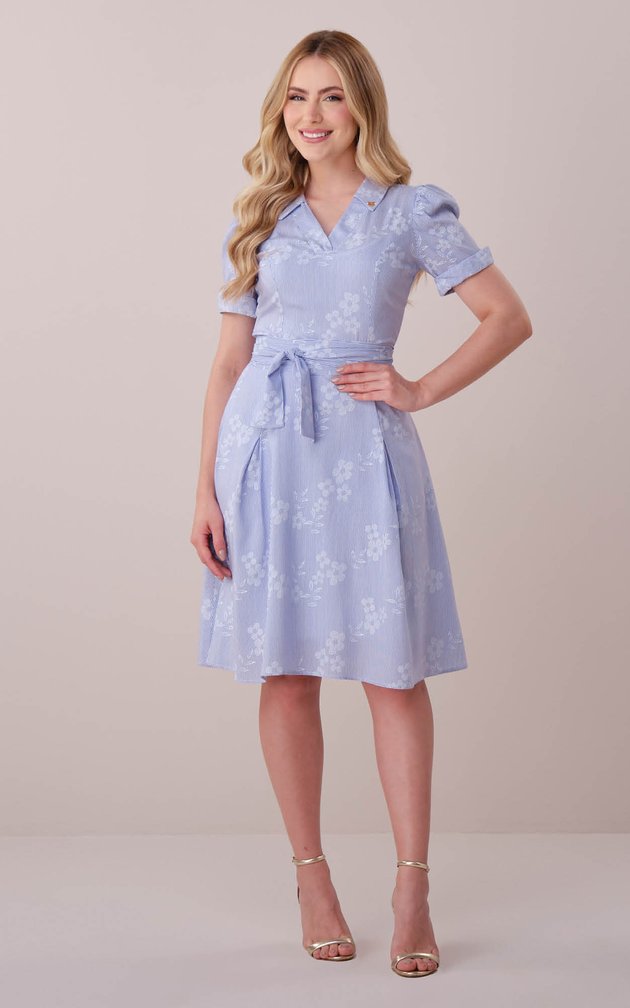 Este vestido midi une o frescor da viscose ao charme delicado da estampa que mistura listras e flores, resultando em uma peça sofisticada e versátil. O decote em V com gola e os recortes frontais alongam a silhueta, enquanto a faixa ajustável na cintura proporciona caimento impecável.