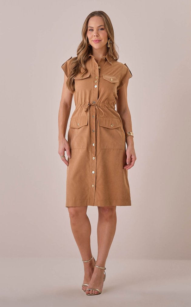 Este vestido midi une a sofisticação da alfaiataria aveludada com elementos utilitários que garantem estilo e praticidade. Os detalhes em botões personalizados e o cordão ajustável na cintura realçam a silhueta com elegância e versatilidade.