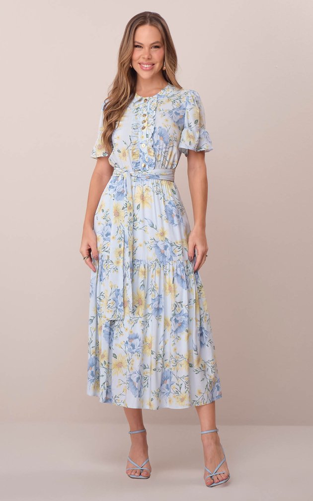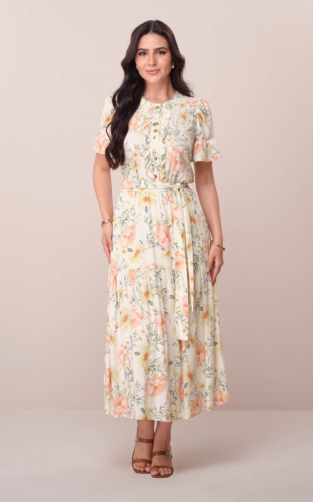 Confeccionado em viscose fluida com estampa floral, este vestido traduz feminilidade com elegância. Os babados delicados e a modelagem equilibrada valorizam a silhueta de forma natural, tornando a peça perfeita para ocasiões diurnas e especiais.