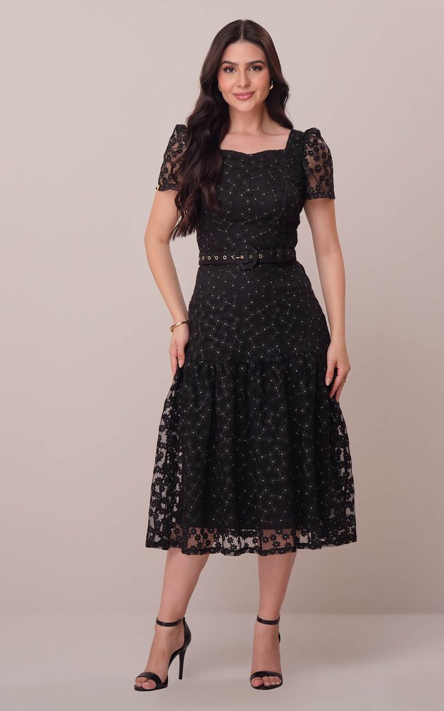 Delicado e refinado, este vestido midi combina o romantismo do tule com o luxo discreto dos bordados em fios dourados. A peça apresenta modelagem que valoriza a silhueta de forma natural, com cintura marcada e saia fluida. O cinto encapado no mesmo tecido complementa o visual com sofisticação, enquanto o forro interno garante conforto e caimento impecável.