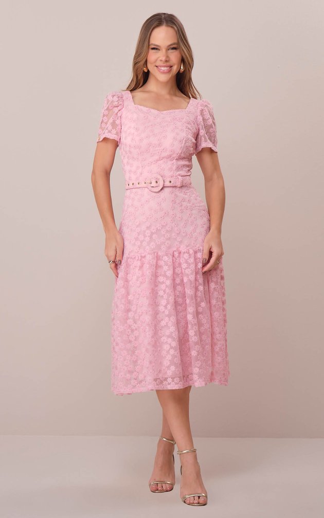 - Modelagem: Midi, ajustada na parte superior e com saia franzida.
