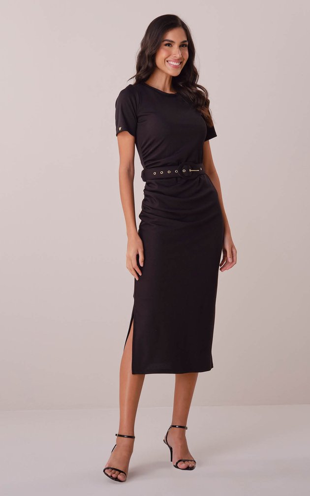 Este vestido maxi midi une praticidade e refinamento em uma peça única. Confeccionado em malha ribana, ele valoriza a silhueta com seus franzidos, criando um efeito delicado e moderno, enquanto o cinto largo encapado com fivela também encapada garante um acabamento elegante e estruturado.