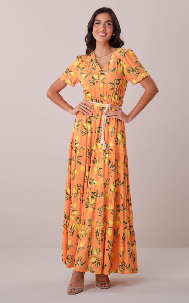 Este vestido longo une leveza e fluidez em um design premium que valoriza a silhueta com naturalidade. A estampa vibrante somada à modelagem atemporal resulta em uma peça versátil e sofisticada, ideal para ocasiões que pedem charme e frescor.