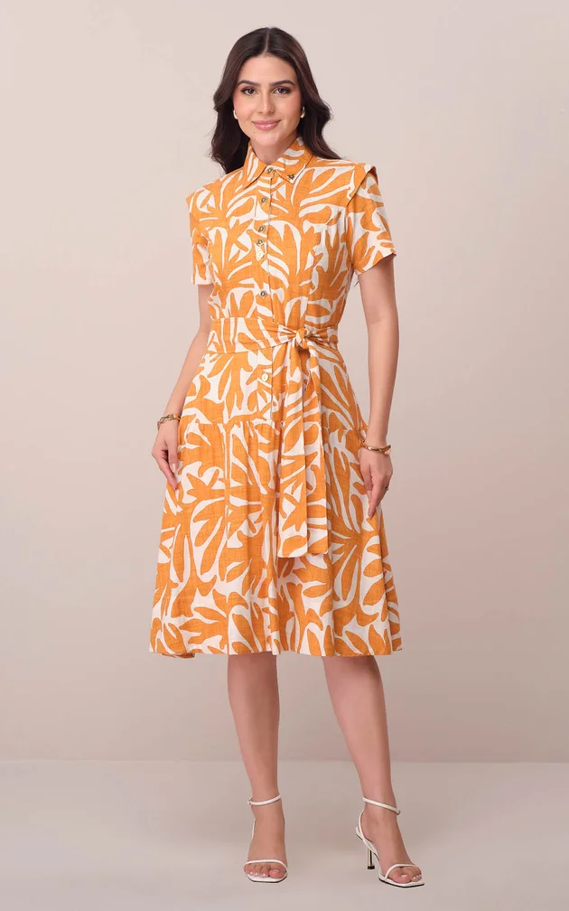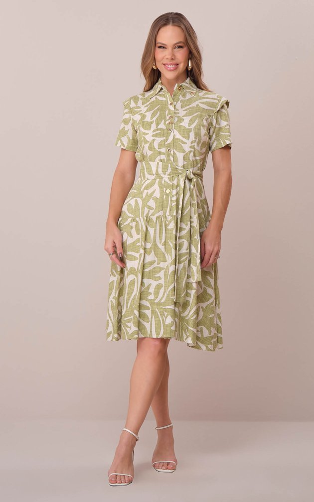 Com design camiseiro e estampa de folhagens, este vestido traduz sofisticação e frescor em um único modelo. Sua modelagem valoriza a silhueta com naturalidade, enquanto a faixa ajustável na cintura acrescenta estrutura e delicadeza ao visual.