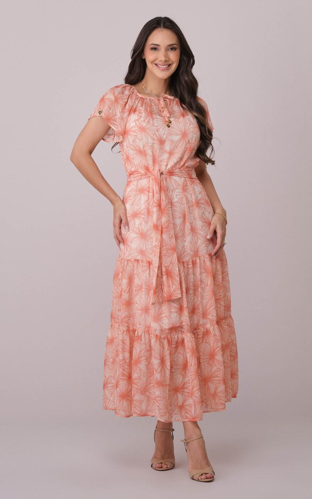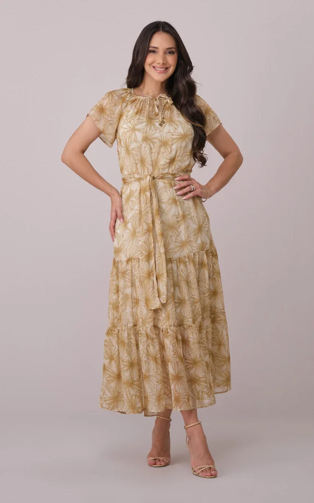 Um vestido que une estampa marcante e leveza em um visual feminino e refinado.