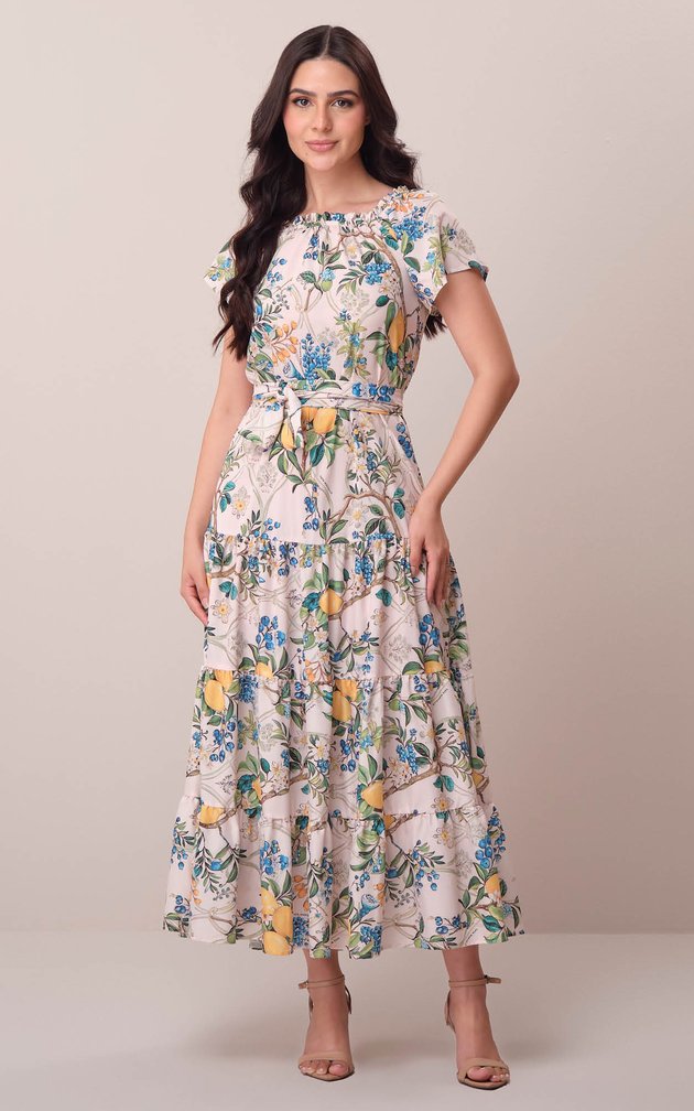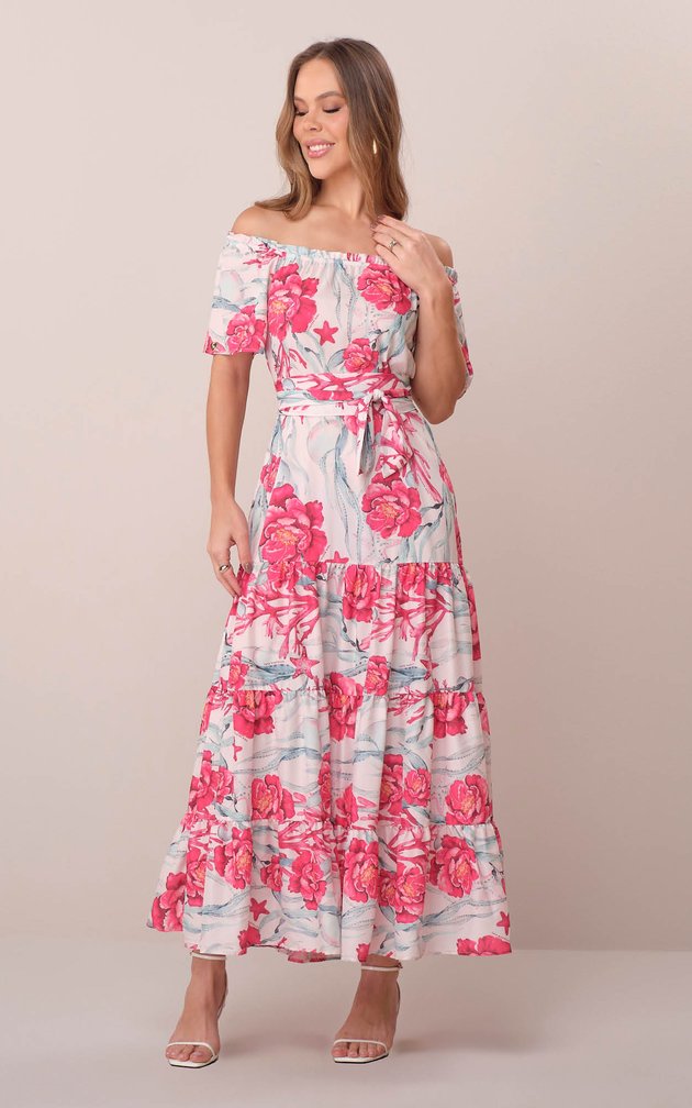 Confeccionado em crepe gloss de caimento refinado, este vestido longo combina leveza e elegância em uma peça atemporal. A estampa exclusiva valoriza o frescor da estação, enquanto os detalhes cuidadosamente elaborados conferem feminilidade e sofisticação ao look.