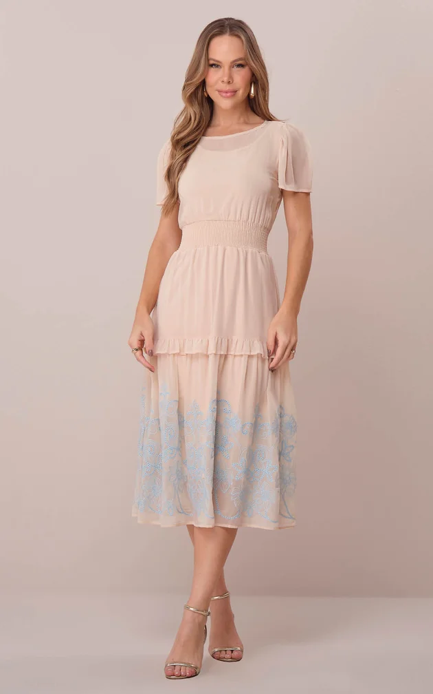 Delicado e fluido, este vestido em crepe foi desenvolvido para valorizar a feminilidade de forma natural. O trabalho minucioso nos acabamentos e a modelagem equilibrada unem conforto, sofisticação e sutileza em cada detalhe.