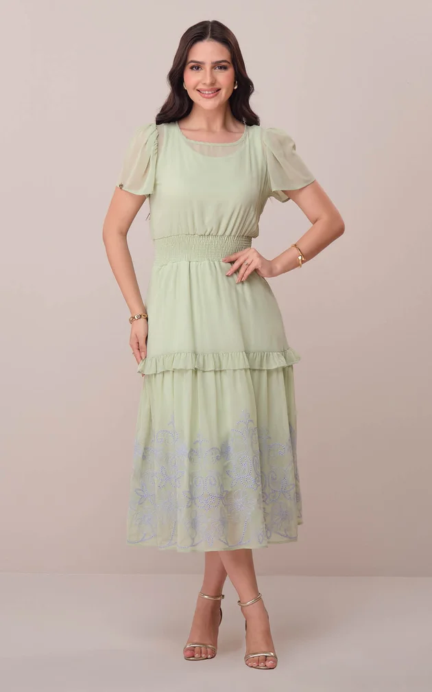 - Modelagem: Midi, ajustado com cintura marcada .