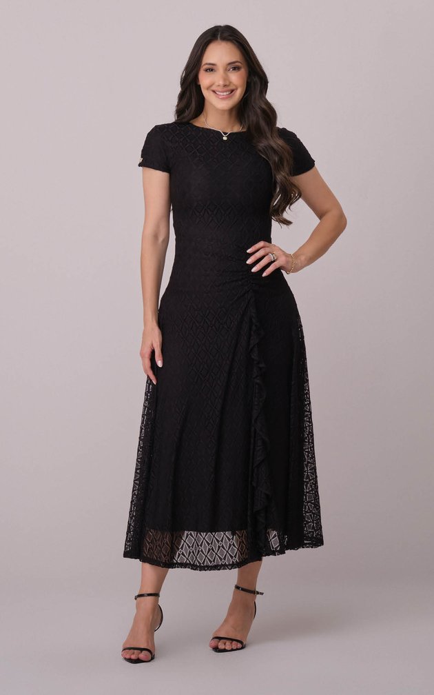 Um vestido que combina textura sofisticada e design delicado em um visual feminino.