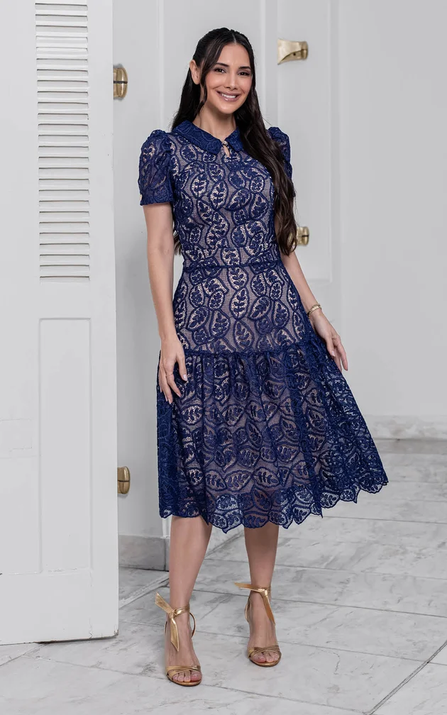 As mangas com volume suave reforçam a feminilidade e valorizam a estrutura do bordado.