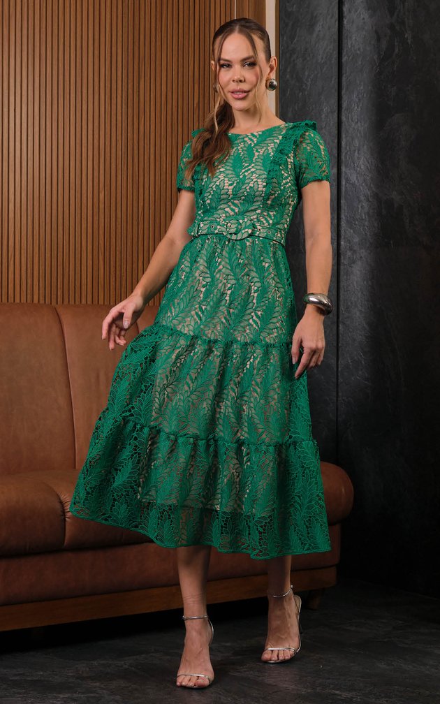 Este vestido maxi midi é a tradução da elegância feminina. Confeccionado em renda delicada, apresenta textura rica e caimento impecável. Os detalhes no busto e nas mangas valorizam o design, enquanto o cinto forrado realça a cintura com sutileza. Ideal para ocasiões que pedem refinamento e delicadeza.