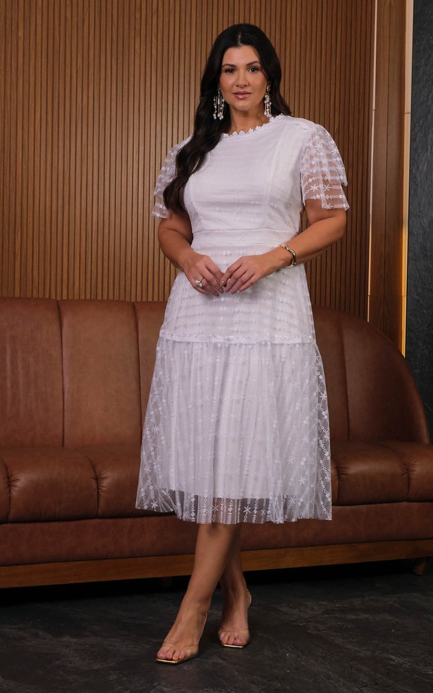 Confeccionado em tule bordado de textura delicada, este vestido traduz a essência da feminilidade com sofisticação. A gola e a saia com detalhes em renda agregam requinte artesanal, enquanto o lastex nas costas proporciona conforto e caimento impecável. Ideal para ocasiões que pedem leveza, elegância e sutileza nos detalhes.