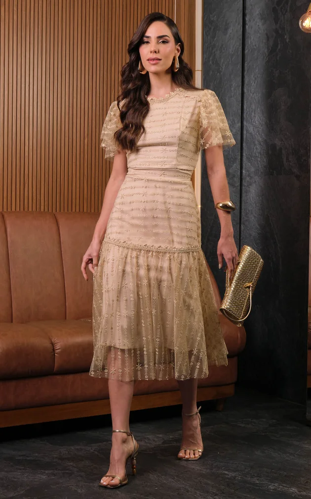 - Comprimento: Midi, ideal para eventos diurnos e produções elegantes.