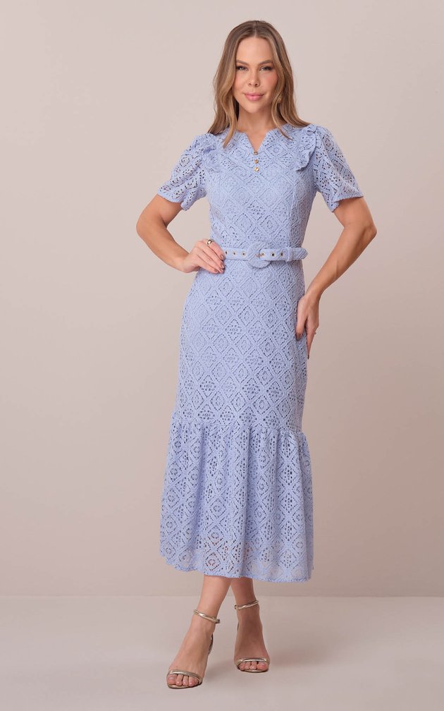 Com acabamento refinado e textura rica, este vestido traduz o equilíbrio perfeito entre elegância e feminilidade. Confeccionado em tela bordada, possui estrutura delicada e caimento impecável, realçado pela cintura marcada e detalhes sutis que tornam a peça única e atemporal.