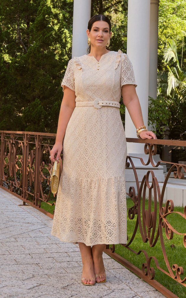- Modelagem: Ajustada ao corpo com leve evasê na barra, valorizando a silhueta de forma elegante.