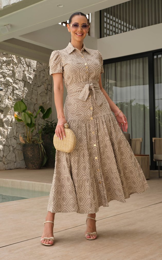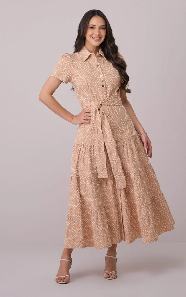 A saia midi em camadas cria fluidez e harmonia ao caminhar.