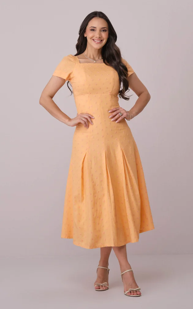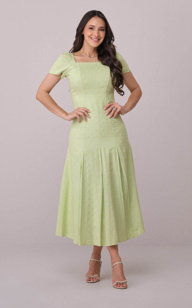 A saia midi com pregas cria fluidez e beleza ao caminhar.