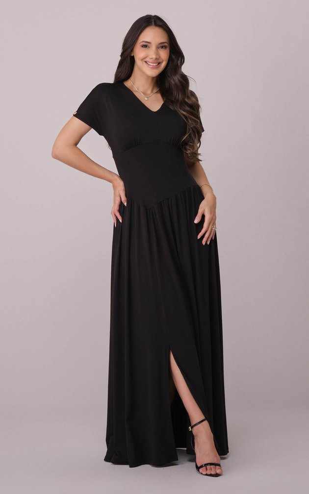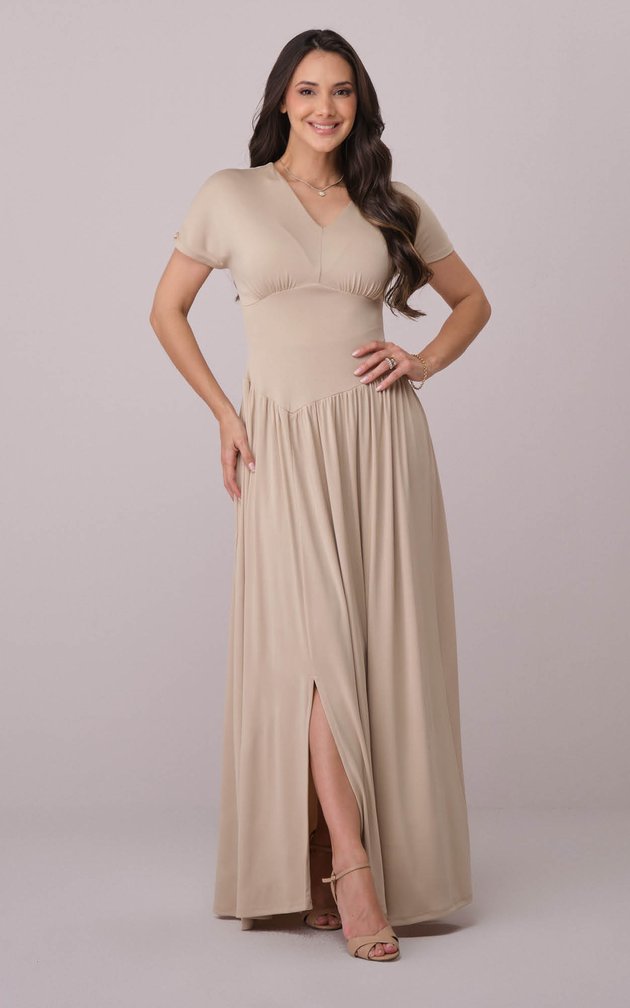 O recorte abaixo do busto cria um efeito alongado e feminino.