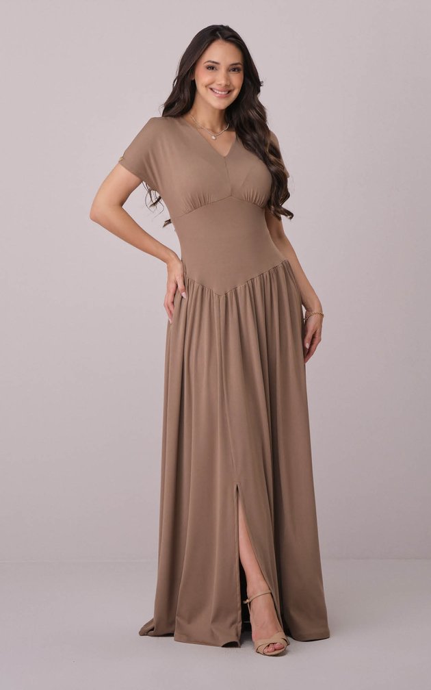 O comprimento longo aliado à saia ampla garante movimento elegante.